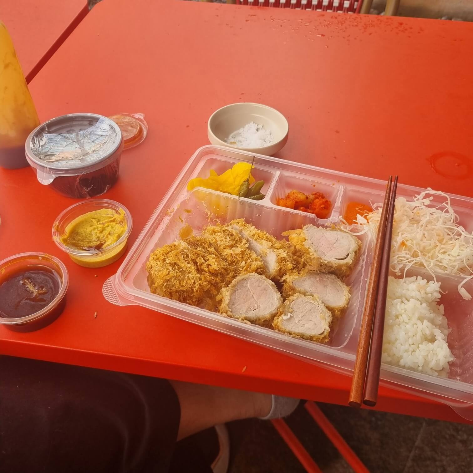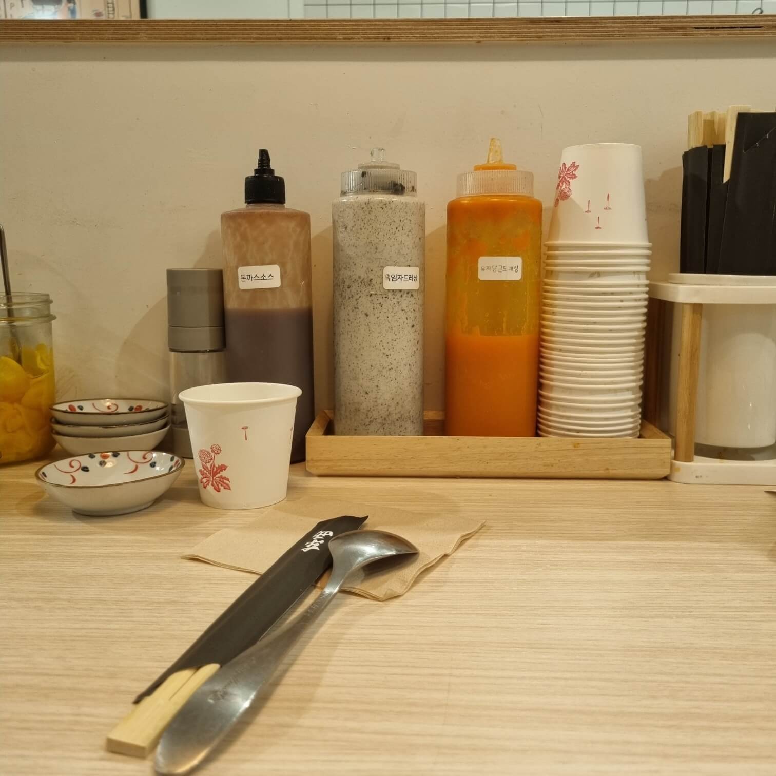 오픈형 키친으로 돈가스가 튀겨지는 모든 행위를 지켜볼 수가 있어요. 샐러드드레싱과 돈가스 소스 그리고 소금 단무지 등은 테이블 1.5인당 1세트 꼴로 놓아져 있고요. 근데 흑임자 소스는 많이 봤지만 당근유자 드레싱은 조금 생소해서 너무 기뻤어요. 저런 건 공산품일리가 없거든요 ㅋㅋㅋㅋㅋ 공산품이 아니라 직접 준비한다 = 정성 가득 맛집 이니까요!