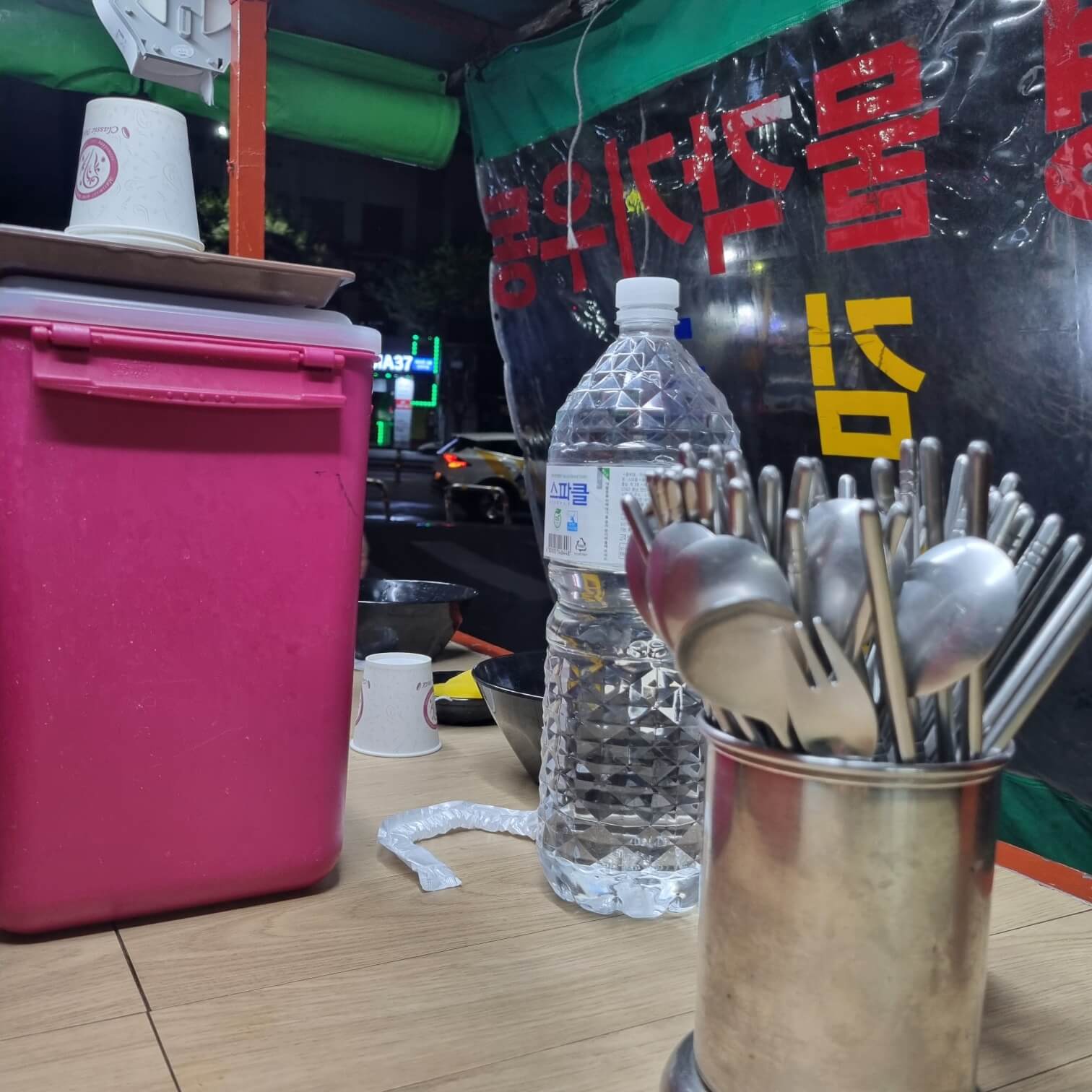 내가 방문한 곳은 할매포장마차. 딱히 이름이 있는 것도 아니고 그냥 주차장 출구에서 가장 가까운 포장마차였다. 그리고 이 포장마차에만 손님이 없어서 들어왔다 ㅋㅋㅋ. 다른 곳에서는 2명의 손님이 서로 떠들며 식사 중이었어서 조용히 먹고 싶어 다른 포장마차를 방문한 것이다. 내부에는 이렇게 수저와 젓가락 그리고 생수통이 마련되어 있다. 당연히 사장님이 안 챙겨준다. 손님들이 각자 알아서 챙겨 마시고 사용하여야 한다. 어색하다면 주위에 다른 손님들을 보며 어떻게 행동해야 하는가 연구하도록 하자. 난 혼자 돌아다니는 것을 좋아하지만, 그런 사람들은 내가 생각했을 때에 눈치가 빠른 사람들일 가능성이 높다.
