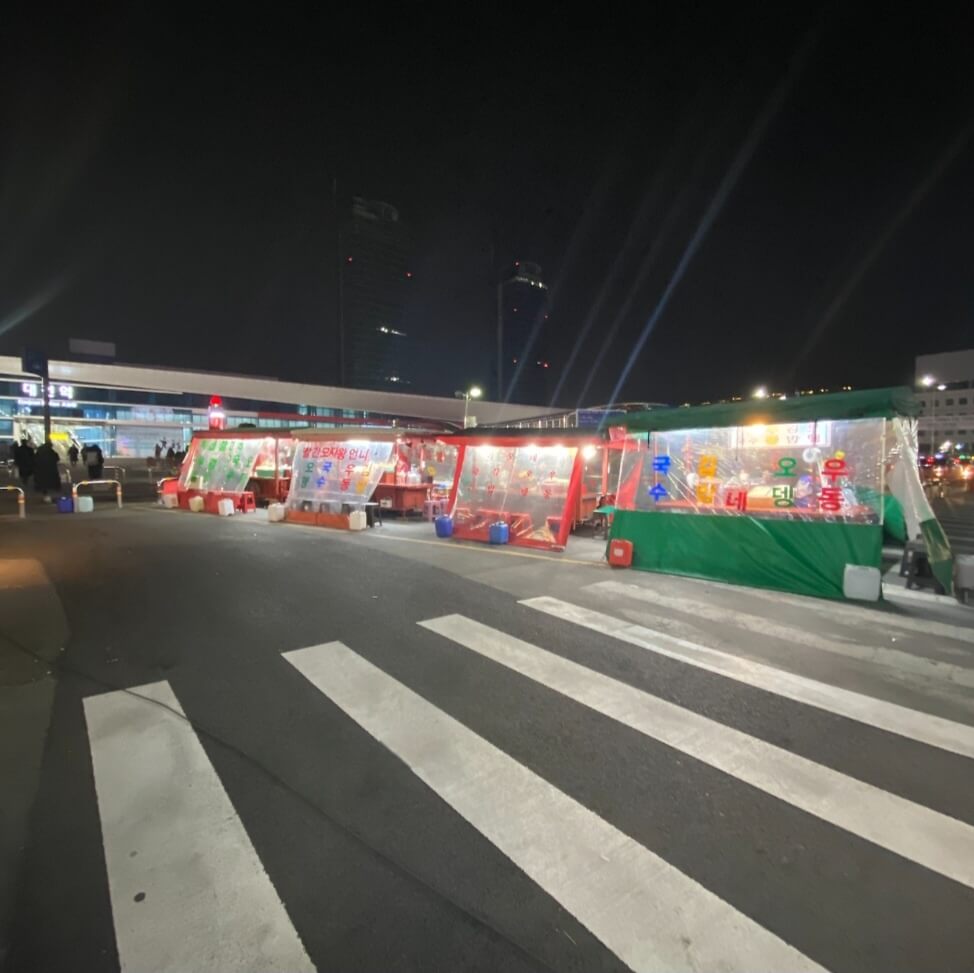 저녁시간대의 대전역은 무수히 인파들과 차량들로 인산인해를 이루며 흘러간다. 서울에서 대전행 KTX 막차를 탑승하여 약 00시 40분 즈음 대전역에 도착했다. 곧장 출구로 나와 실외의 맑은 공가를 들이마시며 대전역을 등 삼아 전경을 스윽 한번 둘러보았다. 대전역 앞에는 포장마차들이 줄 비 되어있는데 막차시간이 끝날 때쯤 다들 들어가는 분위기다. 그리고 눈에 보이는 포장마차가 끝이 아니다. 이것뿐만이 아니라 맞은편 세븐일레븐 골목 안쪽에도 포장마차집들이 많이 보인다. 야근 후에 지친 몸과 허기를 달래러 온 회사원, 회식 후에 해장하러 온 공무원. 대전역에 늦게 도착해서 간단하게 요기할 것을 찾는 학생, 따듯한 국물이 당길 때 등등의 상황에서 방문하기 매우 좋다.