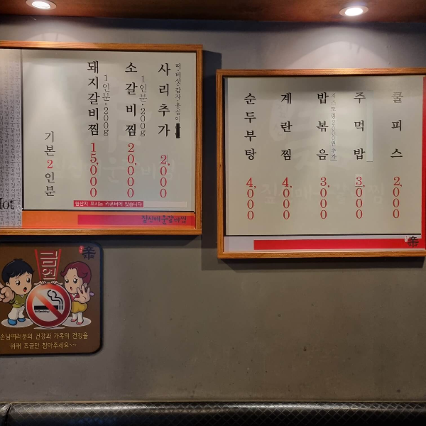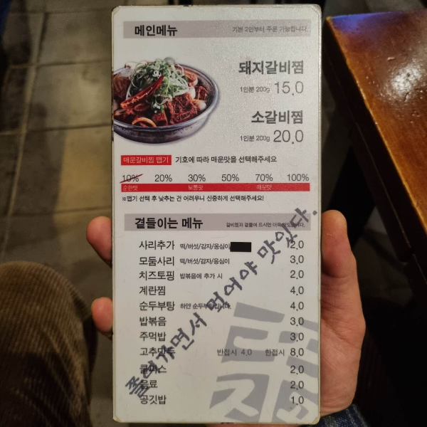 메뉴판이 테이블 위에도 꽂혀있고 벽에도 크게 걸려있어서 찾기도 편하고 가독하기도 편했어요. 그런데 어차피 메뉴는 돼지나 소갈비밖에 없는데 말이죠 ㅋㅋㅋㅋㅋ (메뉴가 많으면 고르는데만 10분 이상 걸리는 나) 친구랑 저는 매운 돼지갈비찜으로 시켰고요, 매운 단계는 30%로 먹었던 거 같아요. 곁들여먹는 메뉴도 다양했는데 돼지갈비에 공깃밥이면 충분히 배 부를 거 같아서 따로 추가로 주문은 안 했어요. 아! 주먹밥을 나중에 시켜 먹었는데요 그때는 이미 만취한 상태여서 주문한 메뉴 사진을 찍을 겨를이 없었어요.ㅠㅠ