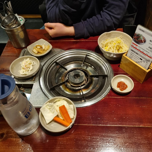 따란! 가장 행복한 순간입니다 음식이 준비되는 시간이죠 두근두근!! 먼저 밑반찬을 깔아주셨어요. 주워 먹을 건 없어 보이지만 말이에요ㅜ 콩나물은 이따 돼지갈비에 넣어 먹으라고 주신 거고 나머지는 그냥 먹는 거죠 맛은 기대 안 합니다. 예... ㅎㅎ 사장님이 옆테이블에서 저희가 주문한 돼지갈비를 최종 조리를 해 주고 계세요. 갈비도 먹기 좋은 크기로 잘라주시고요. 그래서 저희 테이블에 올 때쯤이면 얼마 안 익히고 바로 먹어도 된답니다! 간편하고 아주 좋죠! 이런 시스템 최고야~ 끝내줘!