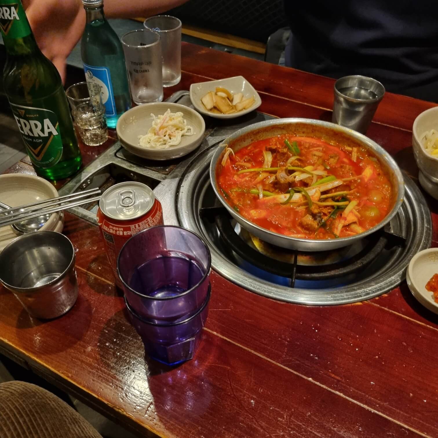 크 지글지글~~ 동영상도 찍었는데 말이죠... 음.. 어떻게 올리는지 모르겠어요... 하나씩 하나씩 배워가고 알아가는 중인 블린이(?)라서요! 그래도 색감 보세요! ㅁㅊㄷ ㅁㅊㅇ~~ 너무 매콤하고 맛있어 보이지 않습니까?? 콩나물까지 추가하니까 아삭아삭하니 너무 좋은 거 있죠? 소주도 술술 넘어가고~ 공깃밥까지 하나 싸악 비워버렸답니다 ㅋㅋㅋㅋ 식사와 함께 한잔이 가능한 동네 식당 맘에 드네요.ㅎㅎ 이게 프랜차이즈라는 걸 가고 나서 알았어요. 원래 매운 걸 즐기는 편도 아니라서요. 밑반찬보고 아 역시 프랜차이즈식당이구나 싶었습죠 예.. 전 밑반찬을 사랑하는 한국인이라구욧..ㅜ.
