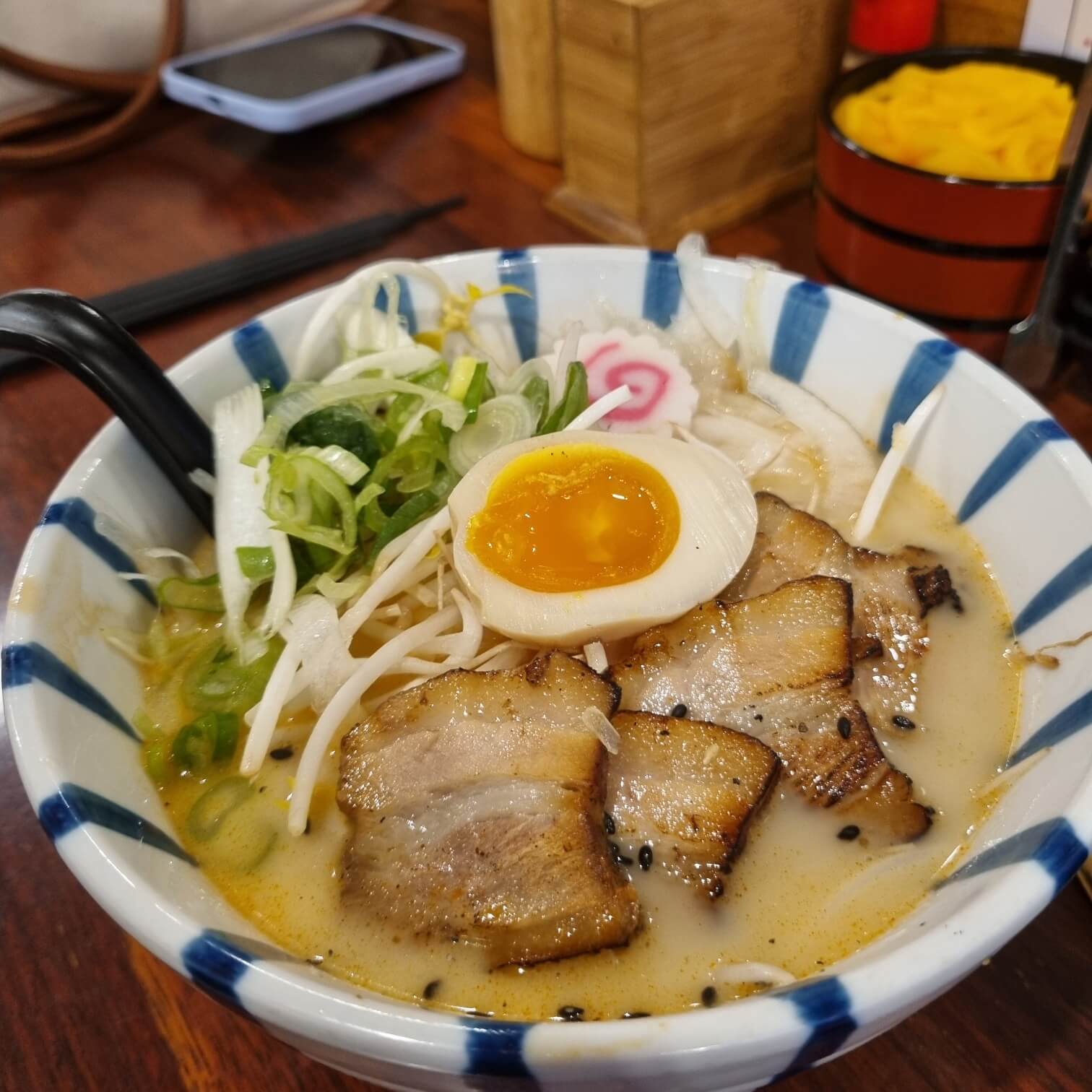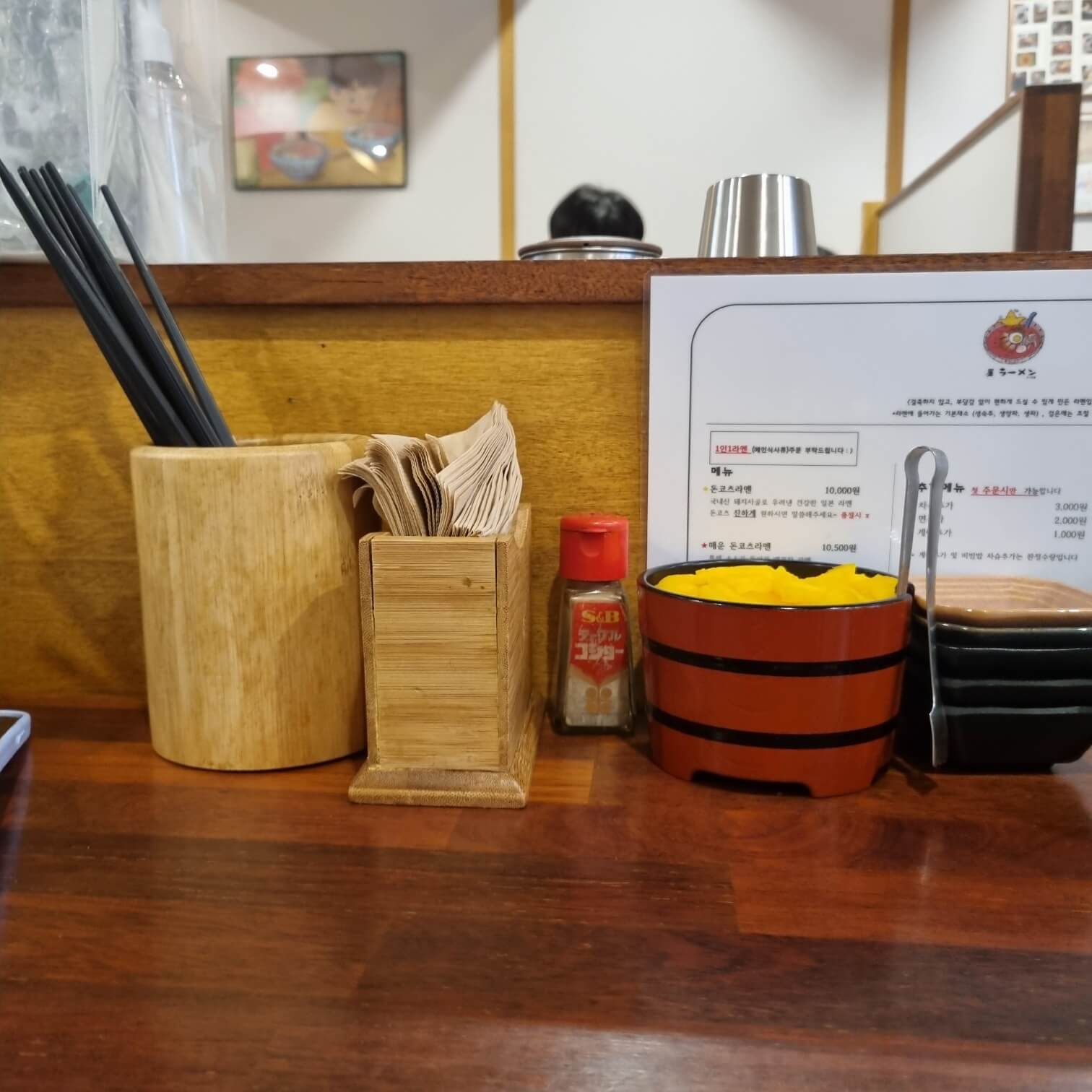 가격도 10,000원대로 저렴하게 측정되어 있어요. 가격도 중요하지만 사실 맛이 가장 중요한 거 아니겠어요?. 하지만 이미 들어오기 전부터 손님들은 많았고... 벽에 연예인분들 싸인도 많기도 하고... 이 정도면 자동으로 맛집 인정 되는 거 아니겠어요? 그래서 전 매운 돈코츠라멘 2단계와 차슈 비빔밥을 시켰어요. 일반 돈코츠라멘은 제 입맛에는 좀 느끼해서 살짝 매콤하면 느끼함을 사악 잡아주지 않을까 하고 주문했습니다. 이때까진 몰랐어요.. 저 추가메뉴가 "첫 주문"시에만 주문이 가능하다는 걸요... 나는 왜 면을 추가 안 하였을까... 나는 왜 차슈를 더 추가하지 않았을까.. 하고 말이죠