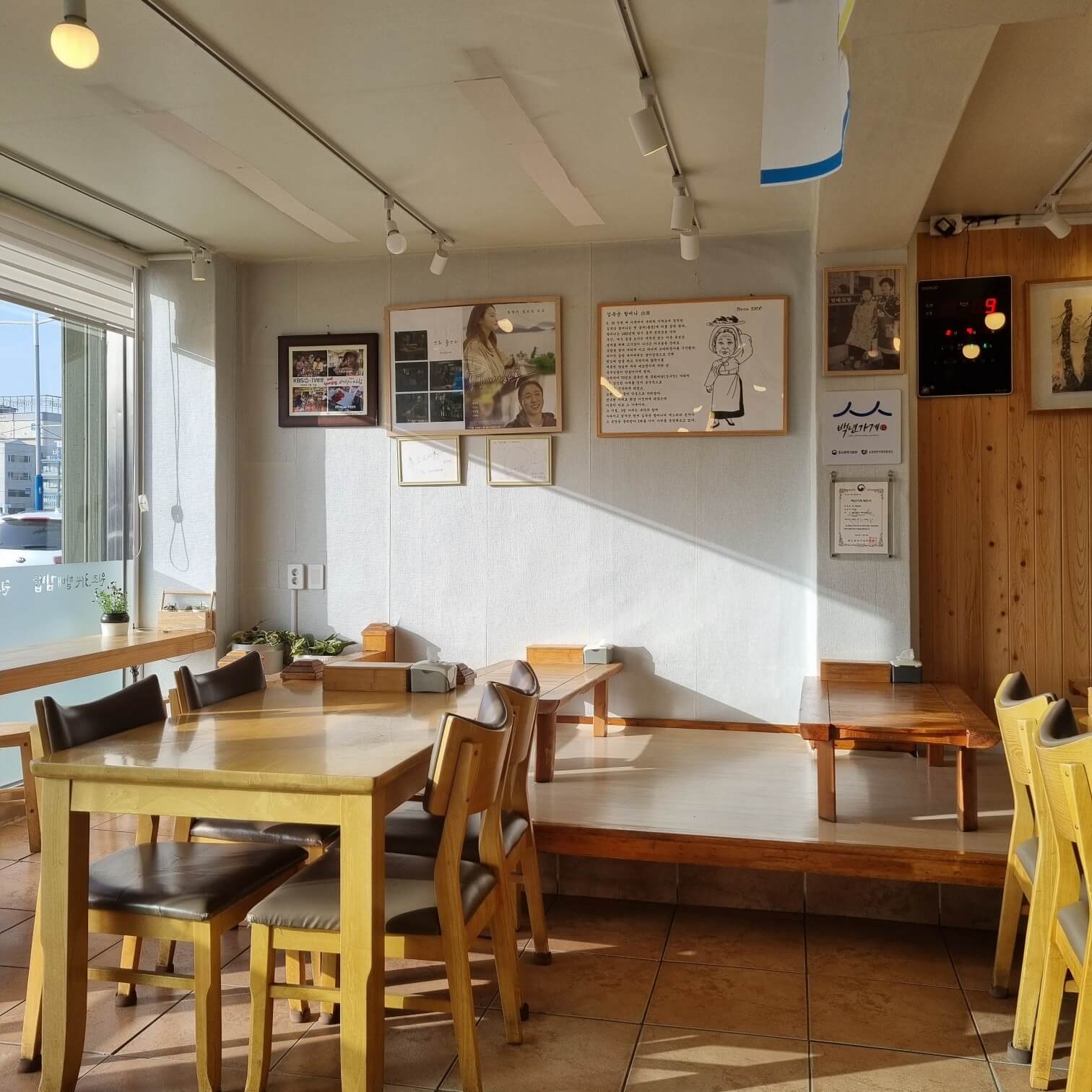 좌석은 입식과 좌식 두 가지가 준비되어 있다.  내부 인테리어는 원목을 사용함으로써 차분하고 깔끔한 분위기를 준다.