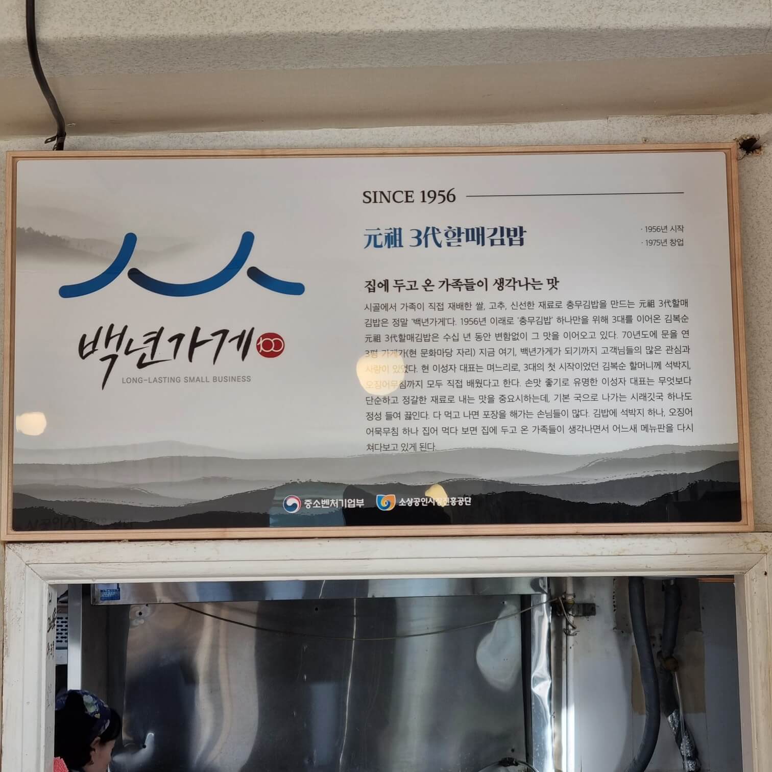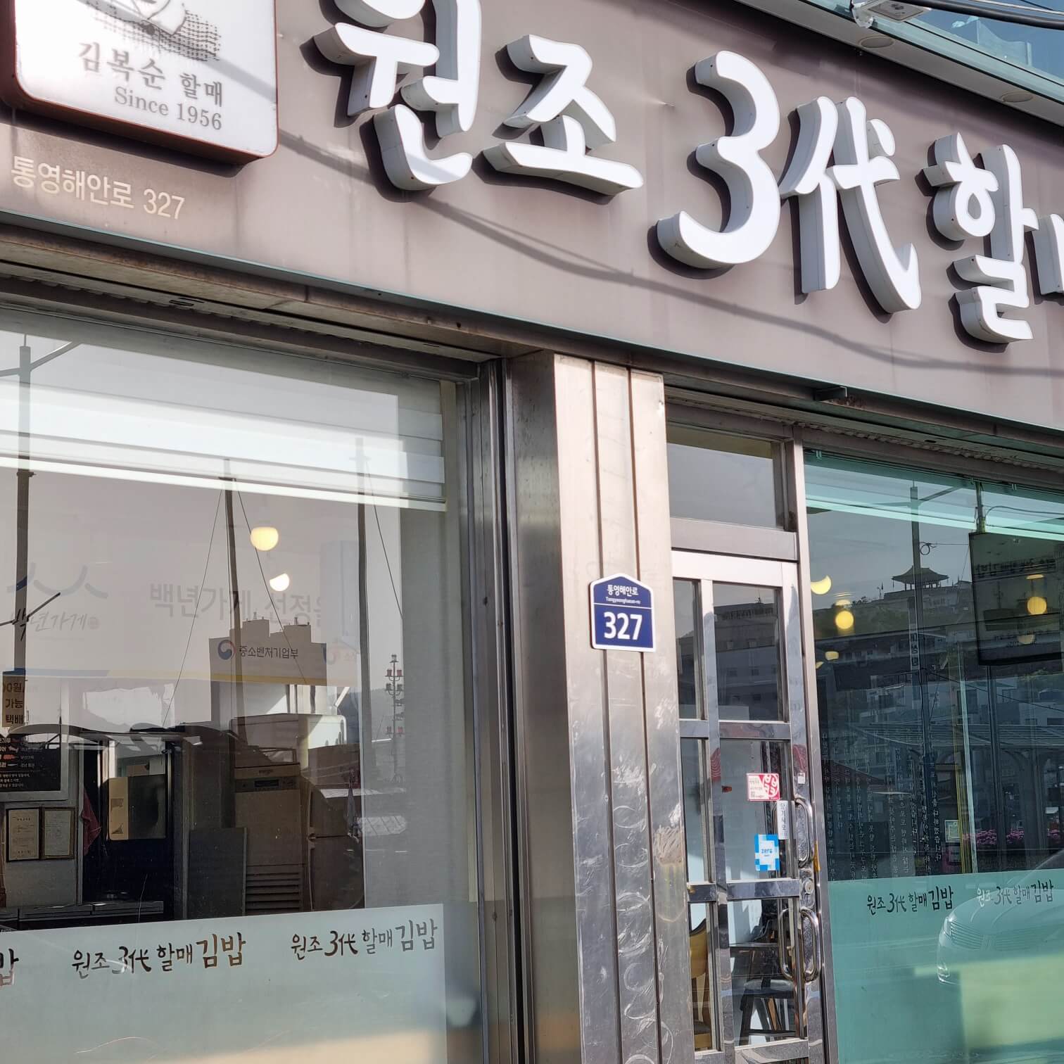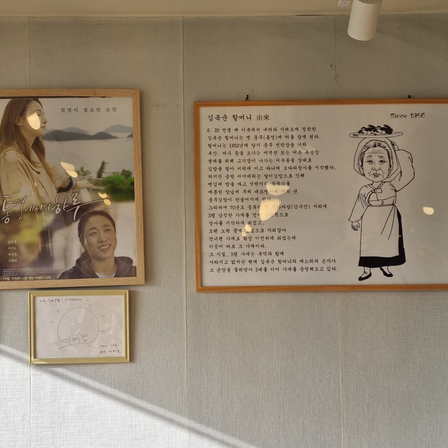 백 년 가게 인증 충무김밥 집이다. 백 년 가게란 "단일 제조업을 제외한 모든 업종 중 30년 이상 업력"을 가지고 있는 인증표와도 같은데... 요즘은 20년 정도 되어도 선정 및 발급해 준다는 이야기가 있다. 왜냐하면 정부의 기준을 완벽하게 통과할 수 있는 노포가 얼마나 되겠는가. 노포+백 년 가게 = 어느 정도 위생이 인증된 가게 정도?. 또한 영화 "통영에서의 하루"의 촬영지이기도 하다. 가게 한편에는 영화포스터가 당당히 걸려 있고 그 옆에는 故김복순 할머니의 由來(유래)가 적혀있다.