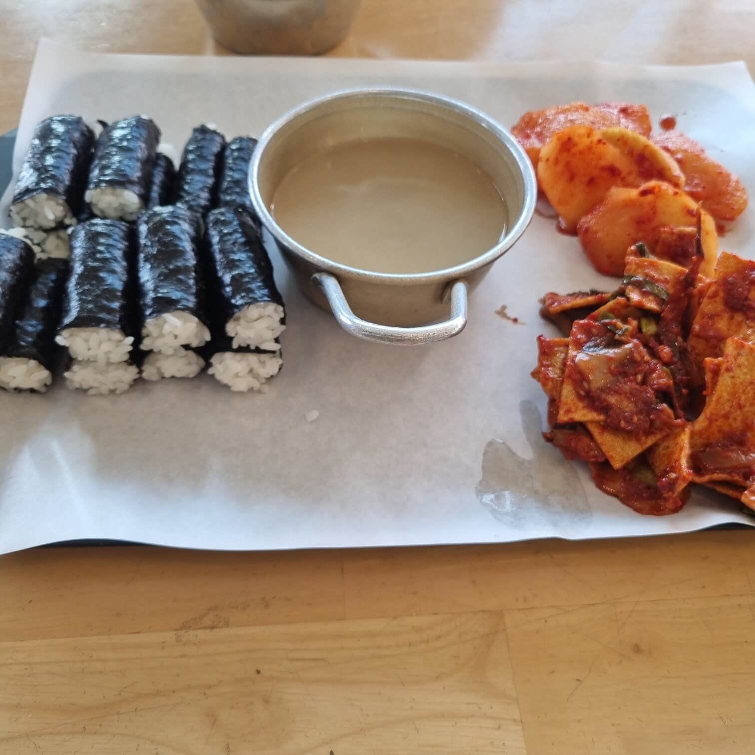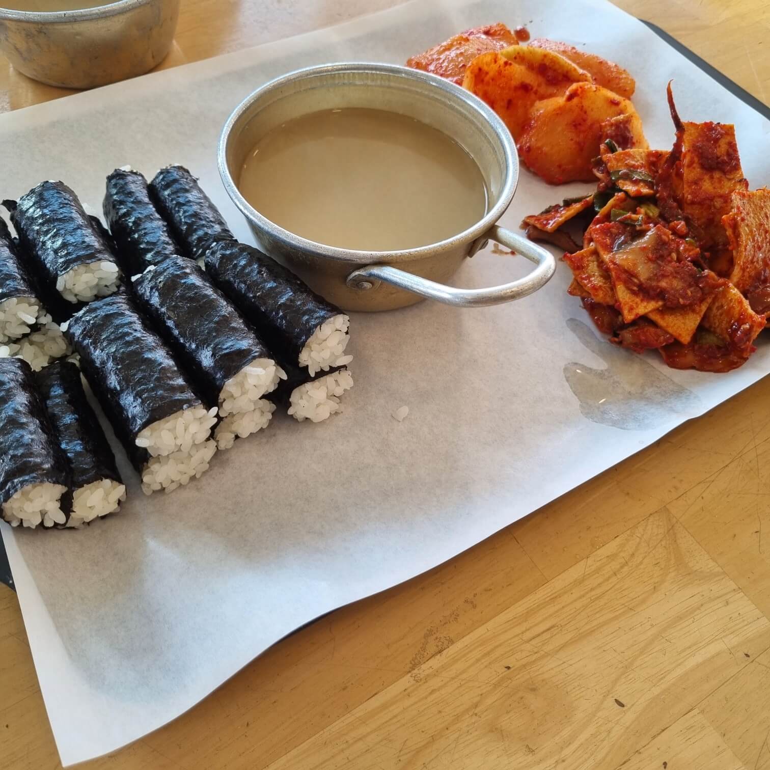 주문하고 음식을 받기 직전까지 무말랭이와 맨김+밥만 나오는 줄 알았는데 이게 웬걸? 섞박지와 오징어 볶음? 무침? 이 나왔다. 국물도 함께 주셨다. 무말랭이와 비교했을 때 큰 차이는 없지만 반찬이 하나 더 있다는 게 기분이 좋았다. 충무김밥 포스트를 하고 있다 보니 충무김밥에 대해 조금 찾아봤는데, 서울식 충무김밥이 생기게 된 계가가 1981년도에 있었다고 한다. 나무위키에 따르면 "국풍 81"이라는 대규모 축제행사 때에 뚱보할매 (지금 김밥집 옆집)를 초청하여 충무김밥을 판매하였는데 3시간도 지나지 않아서 700인분 이상이 되는 양을 판매했다고 한다. 그 인가를 보고 발전해 나간 게 지금 서울의 충무김밥이라고 한다. 원조와 아닌 것 둘 다 먹어봐도 사실 큰 차이는 없다.